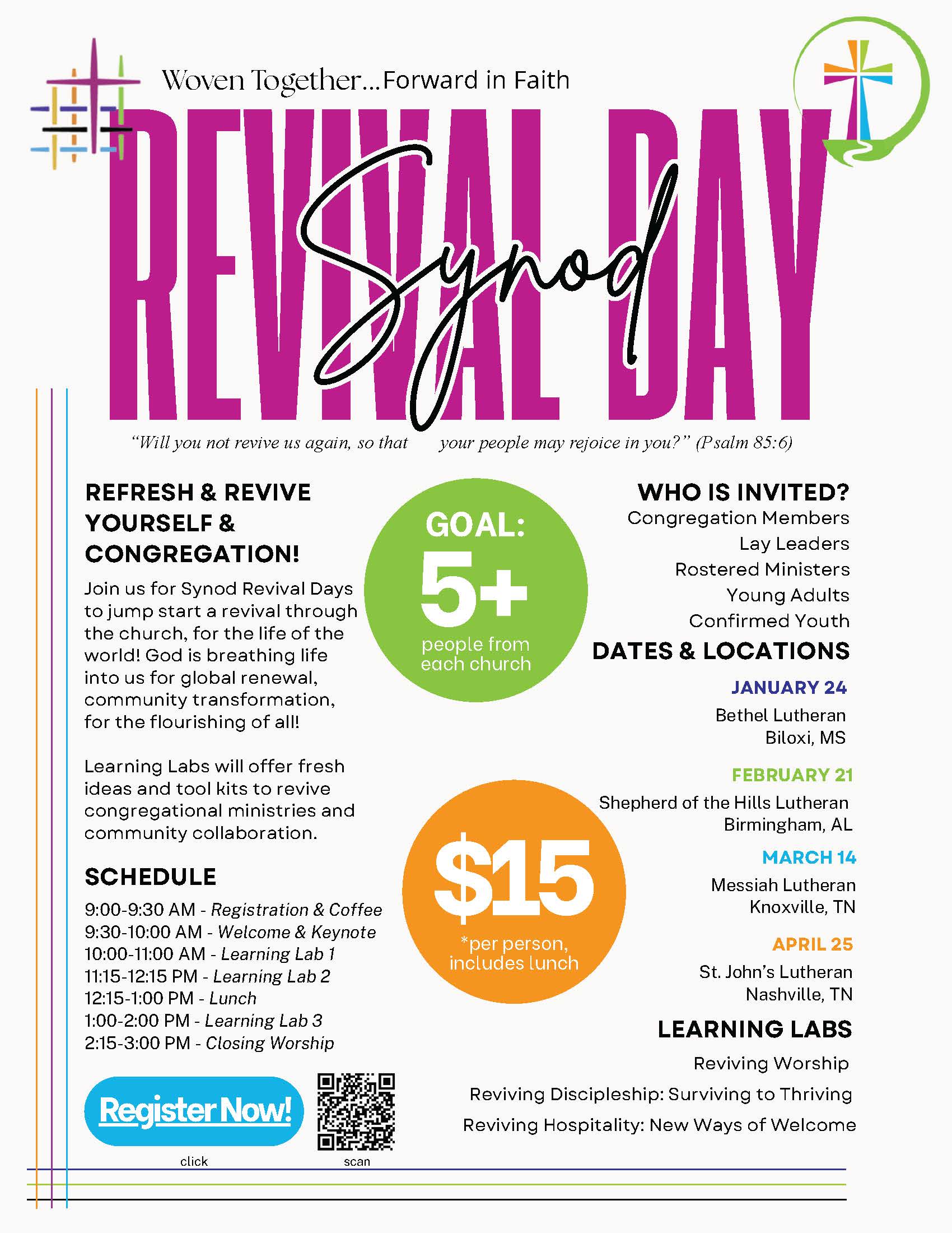 The Southeastern Synod (SES) is one of ELCA’s 65 synods, encompassing 148 diverse congregations, 9 campus ministries, and 7 new mission sites across Alabama, Georgia, Mississippi, and Tennessee. Since the first annual ELCA SES assembly in 1988, the roots of our continuing education and faith formation run deep. Over the past seven years alone, the Synod has provided webinars, workshops, forums, and retreats, among other educational offerings, for thousands of individuals.